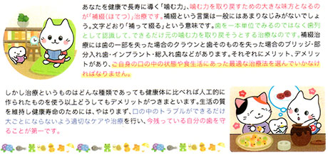 今月号の記事はいかがでしたか。ドライマウスは、自覚症状のある人以外に、潜在的な、予備軍といえるような人がたくさんいます。放置すると、日常生活にも支障が出ますので、少しでも気になることがあったら、お気軽にご相談くださいね。
